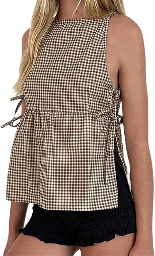 TUWIXIUW Women Tie Side Tank Top Sleeveless Split Peplum Coquette Shirt Plaid Trendy Going Out Summer Tops Y2k Streetwear $16.49
