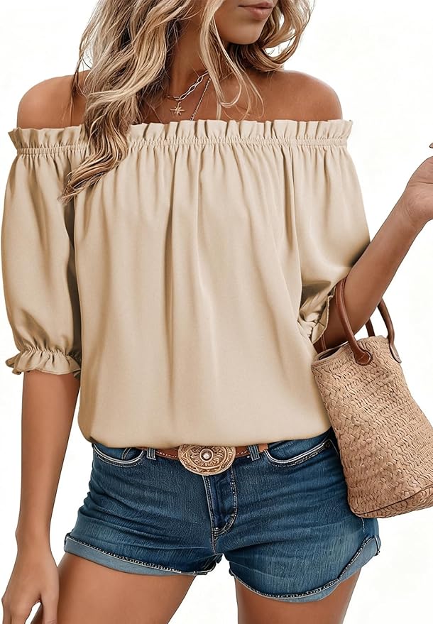 EVALESS Womens Tops Off The Shoulder Blouses for Women Dressy Casual Cute Puff Sleeve T Shirts Fashion, $14.98