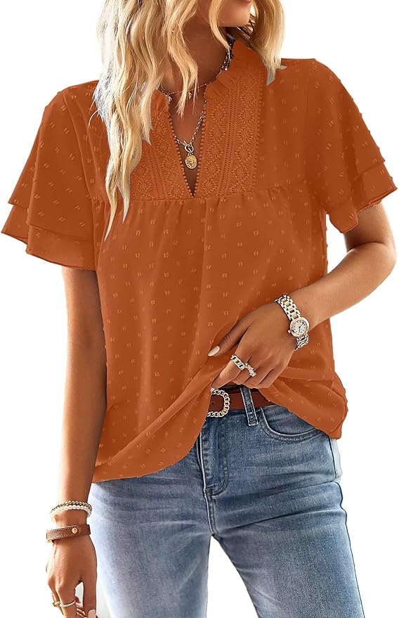 FALECHAY Womens Tops Butterfly Sleeve V Neck Blouses for Women Dressy Casual Flowy Swiss Dot Ruffle Short Sleeve Shirts, $29.99