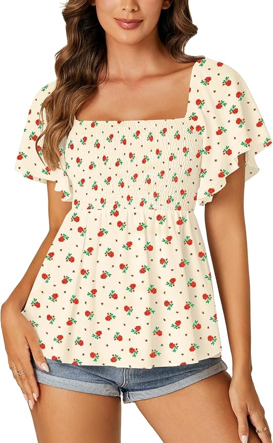 LYANER Women’s Square Neck Smocked Peplum Top Ruffle Short Sleeve Shirred Babydoll Blouse, $26.99